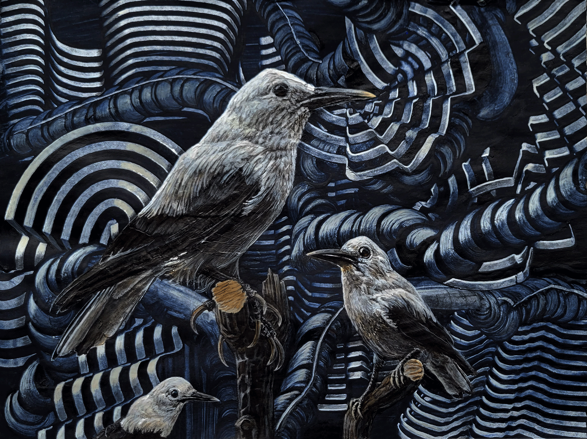 "As art historical metaphor, the bird has been used to represent socio-spiritual themes of regeneration and transcendence. In Shotola-Hardt’s work, this symbolism comes full circle: the bird becomes a feathered humanoid in the narrative and social seat of history painting. The intimate detail and ornate layering of the bird-figure collapses linear history and replaces it instead with the impossible dynamism and forgiveness of flight: it’s as if a Grant Wood landscape crept into the Gothic urbanism of a Dürer print. 'Portrait of Francois I on Horseback (After Francois Clouet),' for example, pays both titular and visual homage to art historical matter as framed by contemporary allegory. There is something comforting and familial in these works, but a foreboding joust with antiquation looms in the knowing eyes of anthropomorphized subjects. Jumping from canvas to canvas, it seems Shotola-Hardt’s subjects are navigably asserting their lineage and identity. Making use of myriad styles, Shotola-Hardt references and re-envisions craft, folk art, Enlightenment still-life, cubism, and cave painting in this exhibition, and the works, in turn, are grounded by a flocking palette of muted gray and a tactile robin’s egg blue ... Shotola-Hardt’s work disrupts the flow of time."